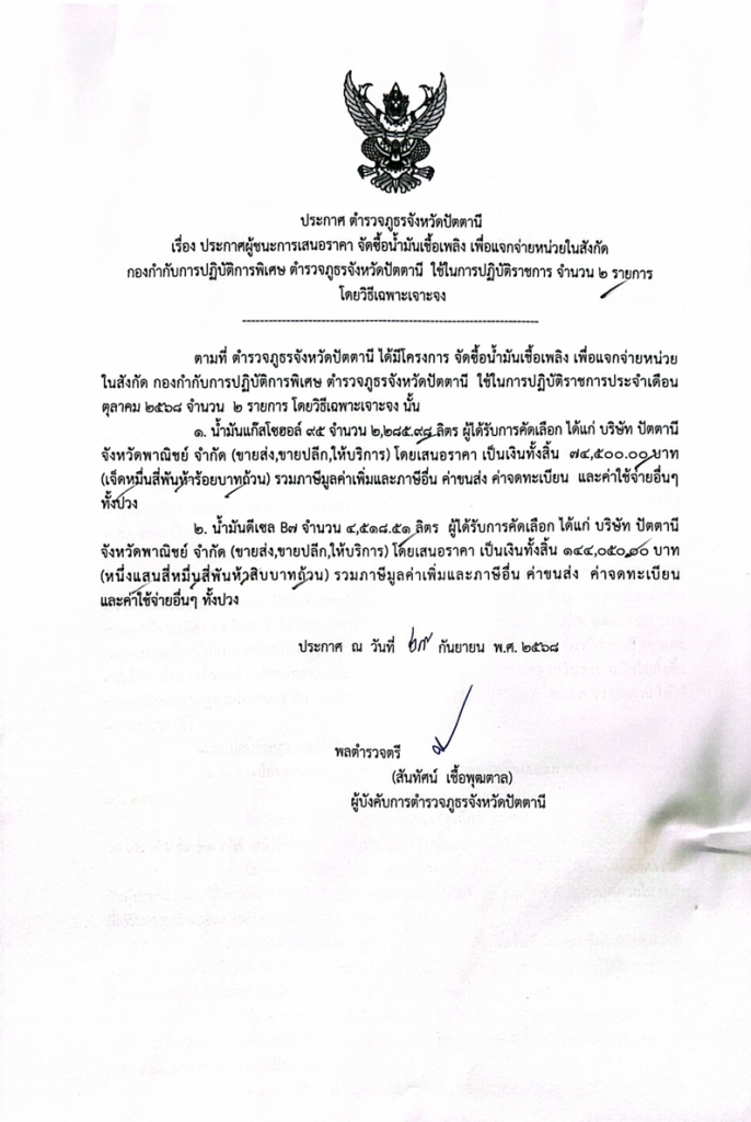 จัดซื้อน้ำมันเชื้อเพลิง เพื่อแจกจ่ายหน่วยในสังกัด กองกำกับการปฏิบัติการพิเศษ ตำรวจภูธรจังหวัดปัตตานี ใช้ในการปฏิบัติราชการ 11 พฤศจิกายน 2025 โดย pattani / ข่าวจัดซื้อจัดจ้าง
