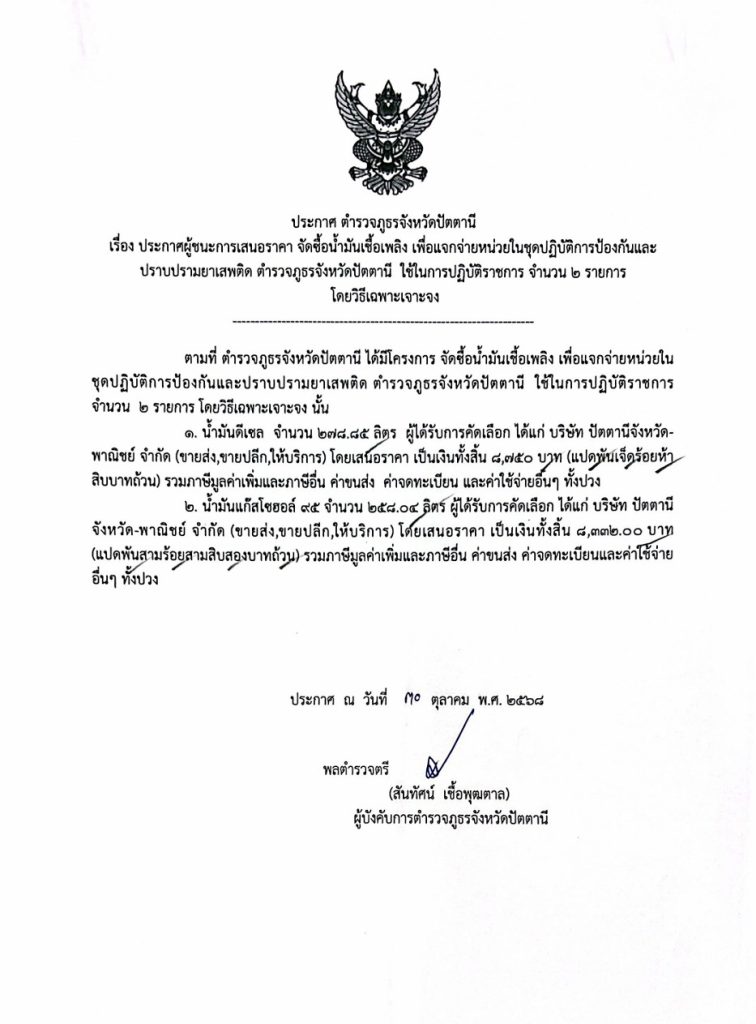 จัดซื้อน้ำมันเชื้อเพลิง เพื่อแจกจ่ายหน่วยในชุดปฏิบัติการป้องกันและปราบปรามยาเสพติด ตำรวจภูธรจังหวัดปัตตานี ใช้ในการปฏิบัติราชการ 20 พฤศจิกายน 2025 โดย pattani / ข่าวจัดซื้อจัดจ้าง