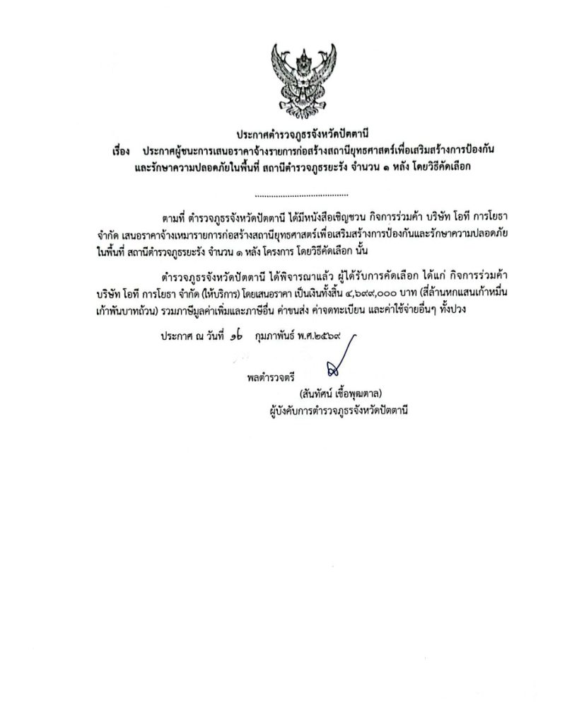 จ้างรายการก่อสร้างสถานียุทธศาสตร์เพื่อเสริมสร้างการป้องกันและรักษาความปลอดภัยในพื้นที่ สถานีตำรวจภูธรยะรัง 22 กุมภาพันธ์ 2026 โดย pattani / ข่าวจัดซื้อจัดจ้าง
