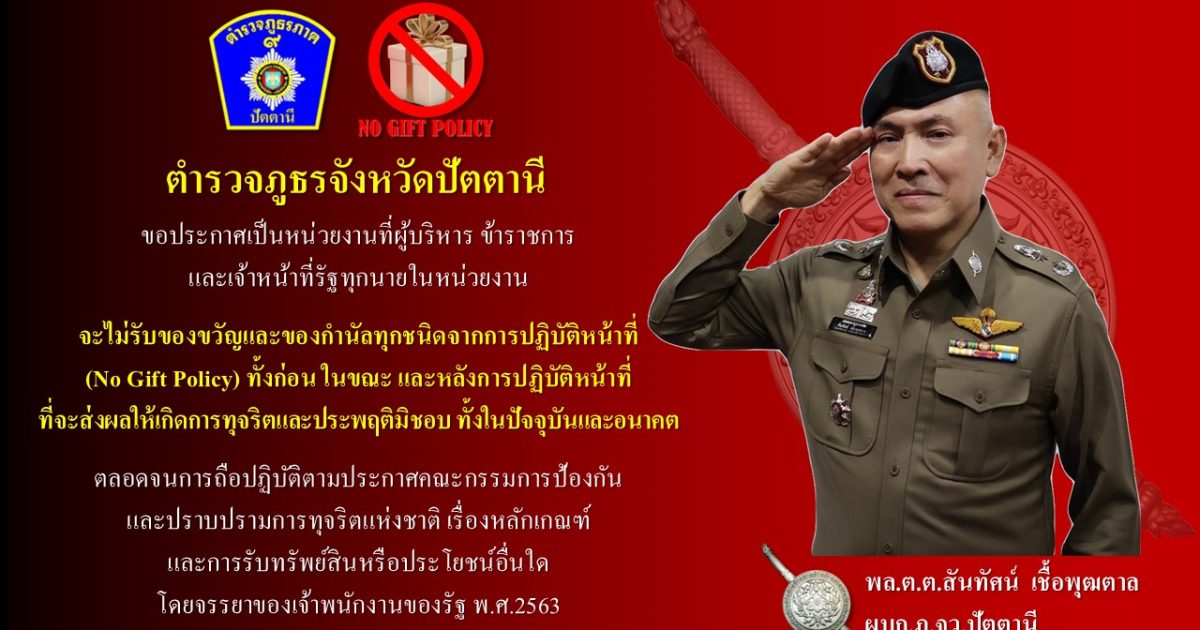 ประกาศ ตำรวจภูธรจังหวัดปัตตานี เรื่อง เจตนารมณ์ที่จะไม่รับของขวัญและของกำนัลทุกชนิดจากการปฏิบัติหน้าที่ (No Gift Policy)