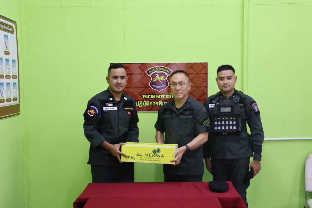 จุดตรวจฐานปฏิบัติการ มว.ฉก.ตร.9212 (โรงน้ำแข็ง) ต่อเนื่อง ปราการ 1 (ดอนรัก) เพื่อกำชับการปฏิบัติ พร้อมทั้งมอบอินทผาลัมเพื่อนำไปแจกจ่ายให้กับพี่น้องประชาชนที่สัญจรผ่านไปมา