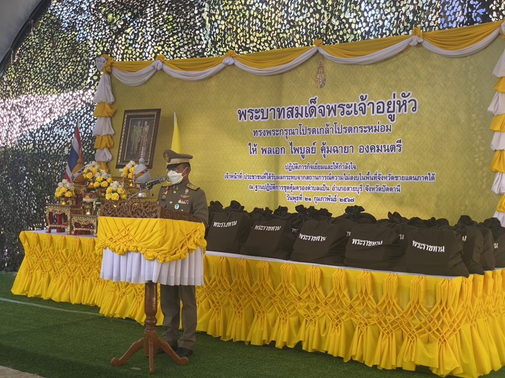 ต่อเนื่องเวลา 15.30 น. พ.ต.อ.กองอรรถ สุวรรณขำ รอง ผบก.ภ.จว.ปัตตานี ร่วมต้อนรับคณะดังกล่าว เดินทางมาเชิญสิ่งของพระราชทานมอบแก่เจ้าหน้าที่และประชาชนที่ได้รับผลกระทบจากสถานการณ์ความไม่สงบในพื้นที่