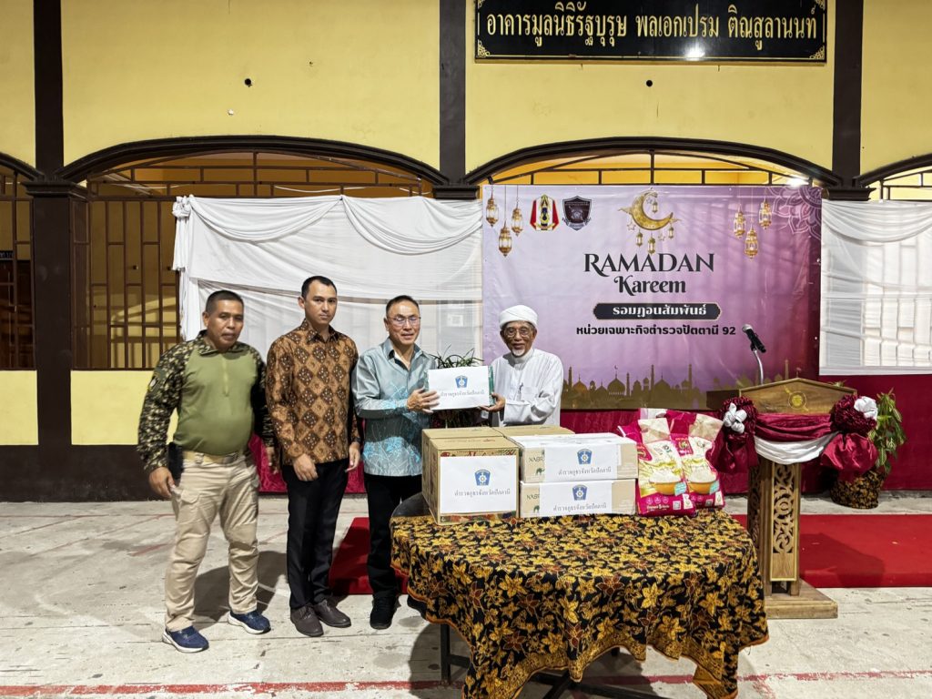 ต่อเนื่องเวลา 19.00 น. ภายใต้อำนวยการของ พล.ต.ท.ปิยะวัฒน์ เฉลิมศรี ผบช.ภ.9 มอบหมายให้ พล.ต.ต.สันทัศน์ เชื้อพุฒตาล ผบก.ภ.จว.ปัตตานี, ว่าที่ พ.ต.อ.ฟาฮามี เฮ็งปิยา ผกก.ปพ.ภ.จว.ปัตตานี ร่วมมอบสิ่งของอุปโภคบริโภคในช่วงการละศีลอด (รอมฎอนสัมพันธ์ ประจำปี 2568) ณ โรงเรียนเตรียมศึกษาวิทยา อ.เมือง จว.ปัตตานี
