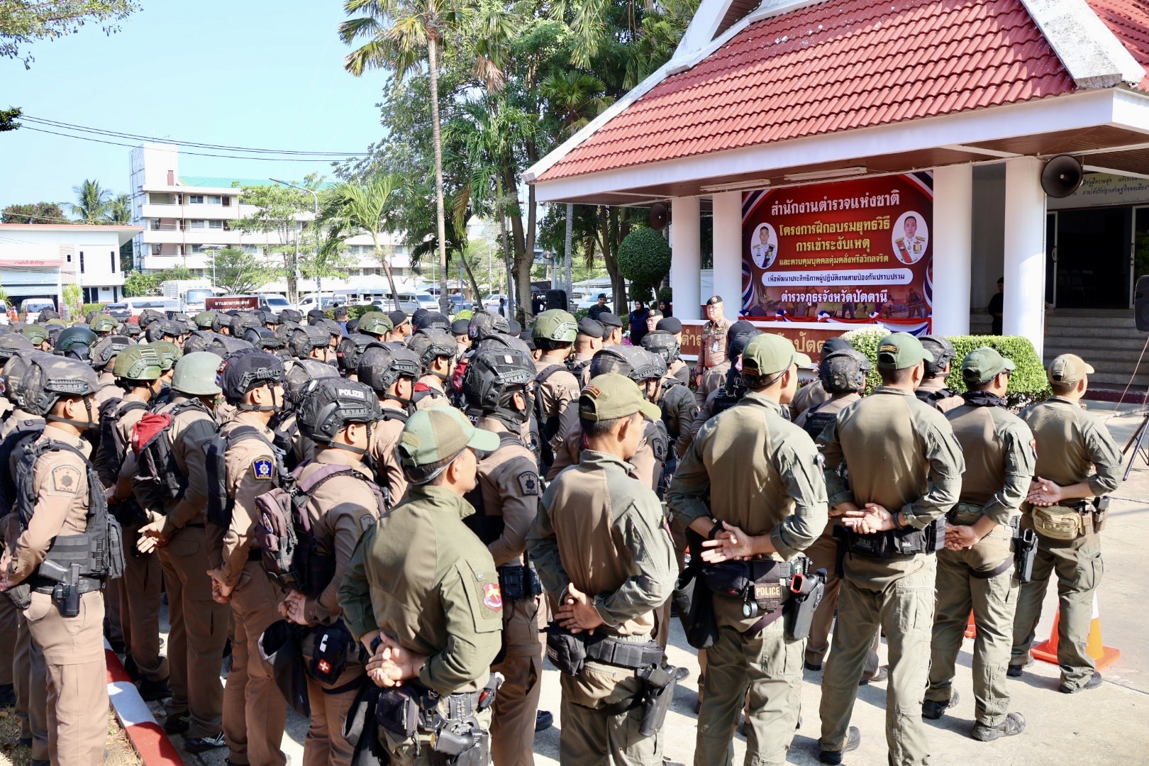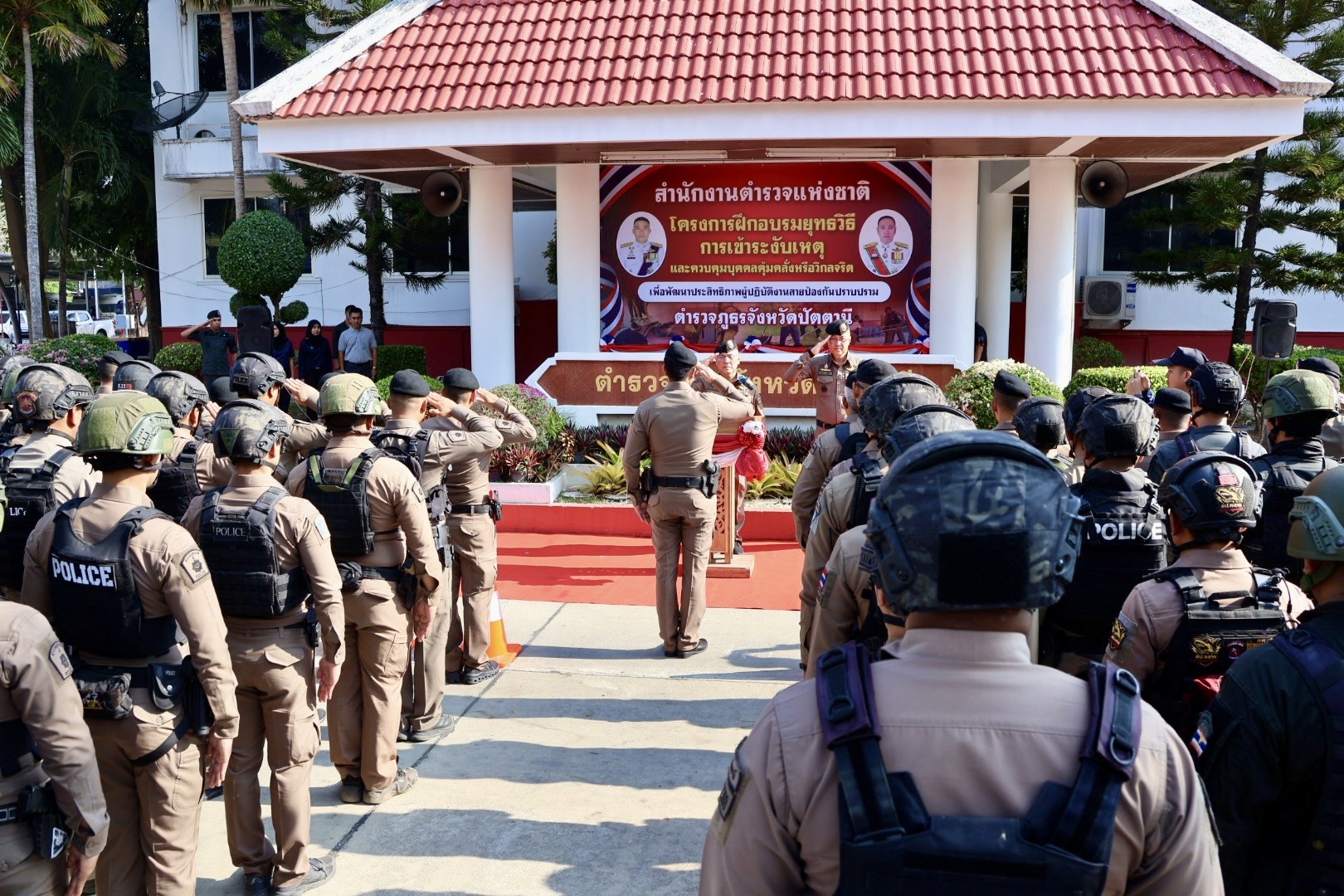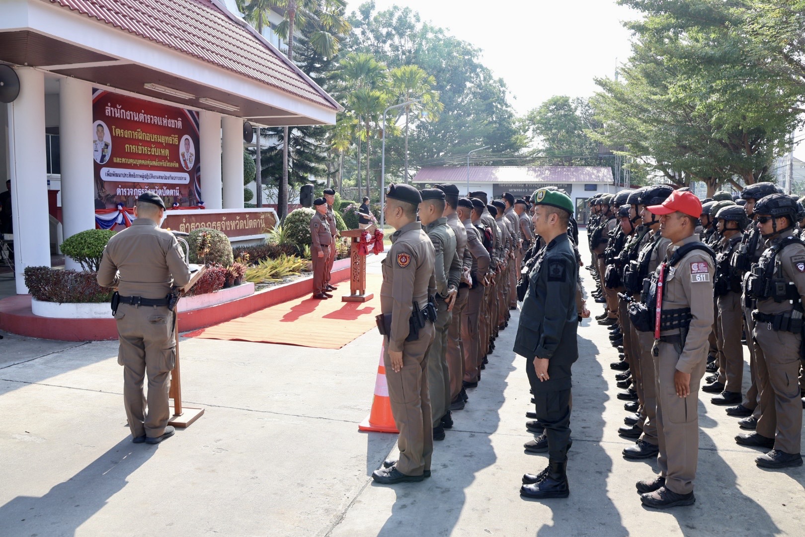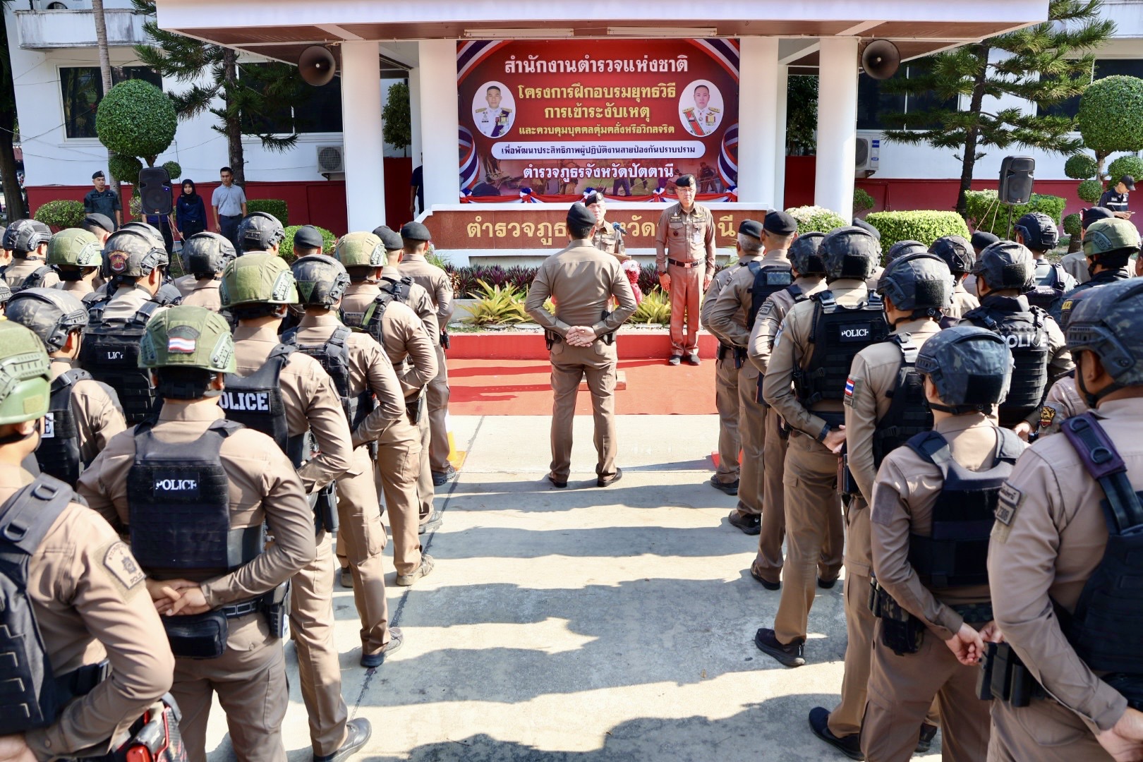 เมื่อวันที่ 9 เม.ย.69 เวลา 08.30 น. พล.ต.ต.สันทัศน์ เชื้อพุฒตาล ผบก.ภ.จว.ปัตตานี (ประธานพิธี), พ.ต.อ.ศุภกร พึ่งรศ รอง ผบก.ภ.จว.ปัตตานี, พ.ต.อ.สนธยา ธูปทอง รอง ผบก.ภ.จว.ปัตตานี ร่วมเปิดโครงการฝึกอบรมยุทธวิธีการเข้าระงับเหตุและควบคุมบุคคลคลุ้มคลั่งหรือวิกลจริต เพื่อพัฒนาประสิทธิภาพผู้ปฏิบัติงานสายงานป้องกันปราบปราม ตำรวจภูธรจังหวัดปัตตานี ประจำปีงบประมาณ พ.ศ.2569 ณ หน้าอาคาร ภ.จว.ปัตตานี